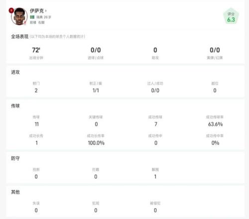雷速体育10月20日宣 英超第八轮焦点战双红会,夏窗加盟利物浦的中锋伊萨克本场比赛首发出战,在比赛第71分钟,被基耶萨换下,伊萨克下场时红军0-1落后。