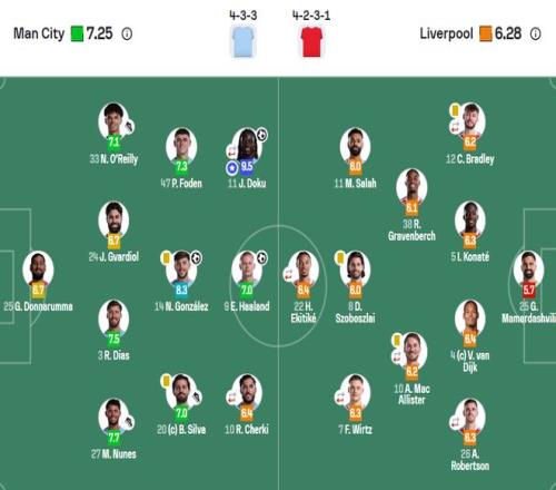 曼城首发:25-多纳鲁马(6.7分)、3-鲁本·迪亚斯(7.5分)、24-格瓦迪奥尔(6.7分)、33-奥赖利(7.1分)、27-努内斯(7.7分)、14-尼科·冈萨雷斯(8.3分)、20-B席(7.0分)、10-谢尔基(6.4分)、11-多库(9.5分)、47-福登(7.3分)、9-哈兰德(7.0分)