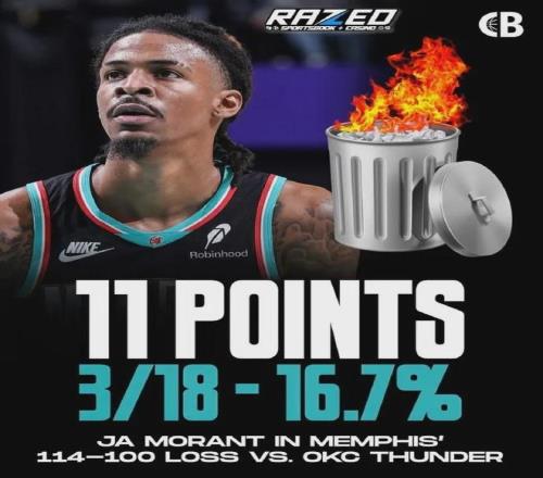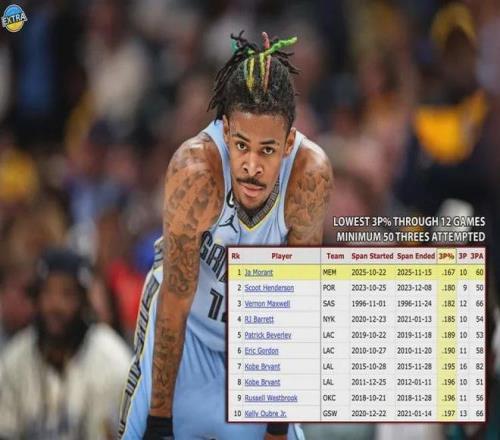 据统计,迄今为止莫兰特三分球60中10,命中率低至可怜的16.7%,在NBA史上所有赛季前12场三分出手数至少50次的球员里面命中率最低。