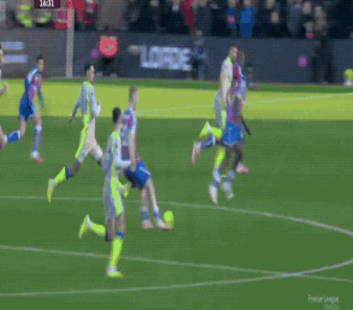 第87分钟,水晶宫球员配合失误,替补登场的萨维尼奥狂奔60多米到了禁区,亨德森被迫将其放倒,曼城获得点球。